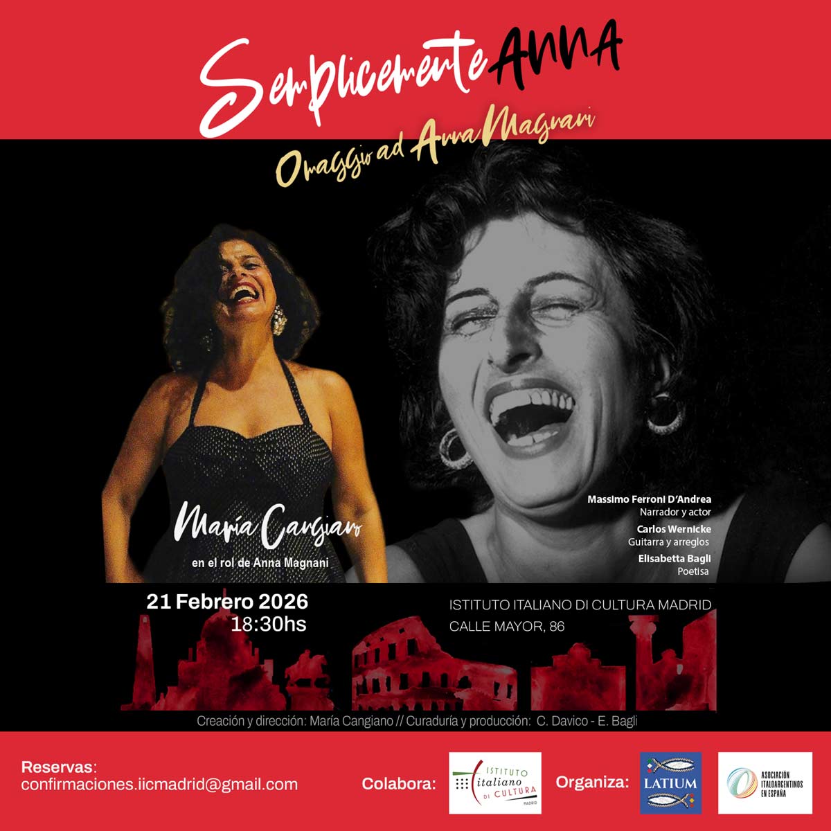 Madrid – El sábado 21 de febrero a las 18:30, el Instituto Italiano de Cultura de Madrid acoge Semplicemente Anna, un espectáculo que combina teatro, poesía y música para rendir homenaje a Anna Magnani, icono del cine italiano y símbolo de la romanidad del siglo XX.